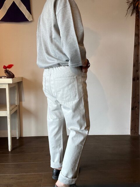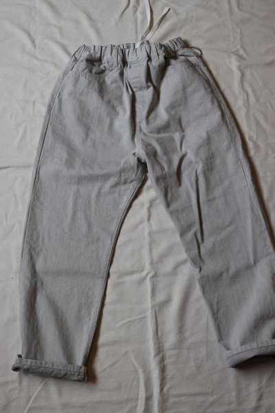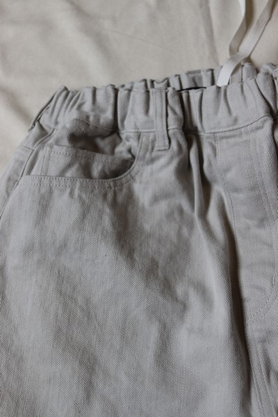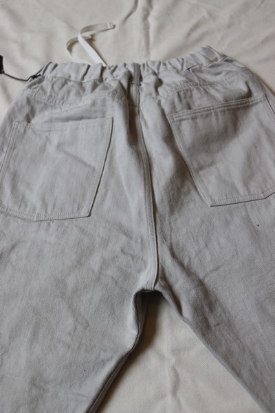 深い股上で楽な腰回り。ウエストはゴムと紐が付いています。緩めにテーパードのかかったすっきりときれいなシルエット。