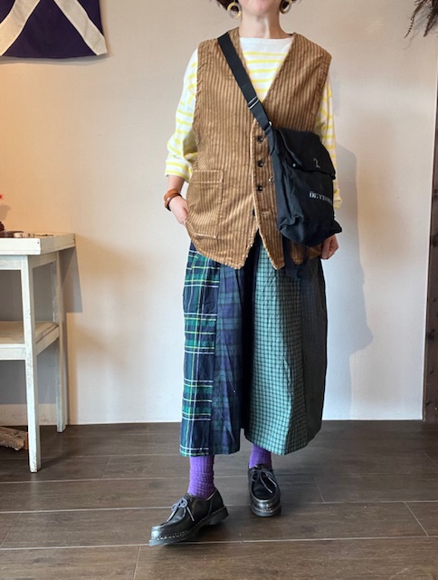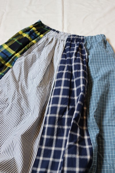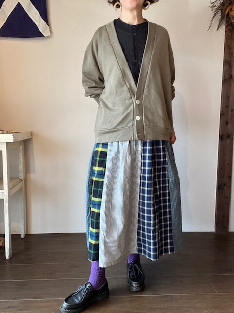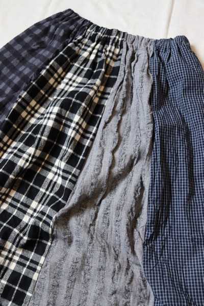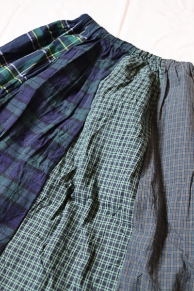 4種類の様々なチェック柄の布帛生地をパネルのように組み合わせた、クラフト感溢れる楽しいスカート。