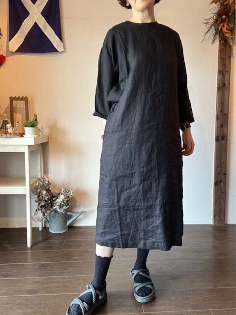 光沢がありサラサラと清涼感がある程よい厚みのリネン素材のワンピース。