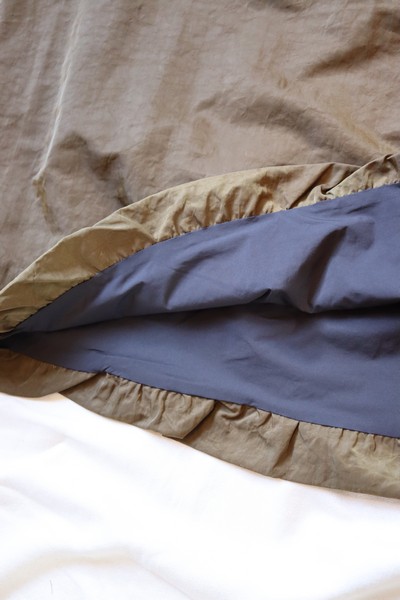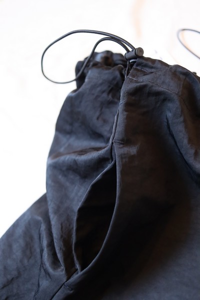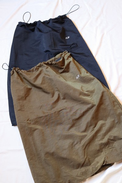 シンプルなデザインのドローストリングウエストのスカートは、丸みのある裾が動きのあるシルエットに。