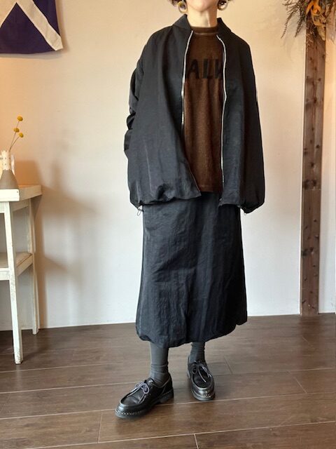 同素材のボンバージャケットとのセットアップ、SQEW-1のようなコンパクトなトップスを合わせて、スカートのボリューム感を活かしたコーディネートも◎