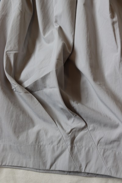 裾のタックを変則的に閉じて独特なたまりを作り、ユニークなフォルムに仕上がっています。