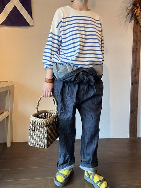 ゆったりとした身幅によるルーズシルエットです。ウエストの紐を絞ることによりシルエットの変化を愉しめます。光沢感のあるインディゴできれいに仕上がります。