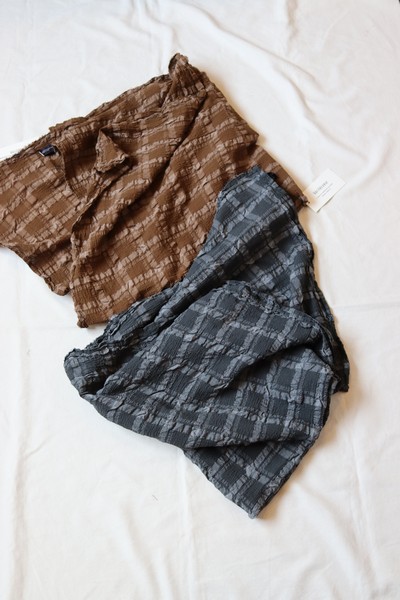 くしゅくしゅとした立体感が魅力の薄手平織り素材です。コットン、ポリエステル、リネンを交織して織られた生地に製品染めを施すことで、素材の縮みの差を活かし特徴的な凹凸を出しています。