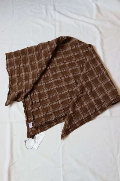 製品染めを施したチェック柄のストール。立体的な凹凸による空気を含んだような柔らかで軽い肌触りが魅力です。大判サイズで首元に程よくボリュームを出すことができます。