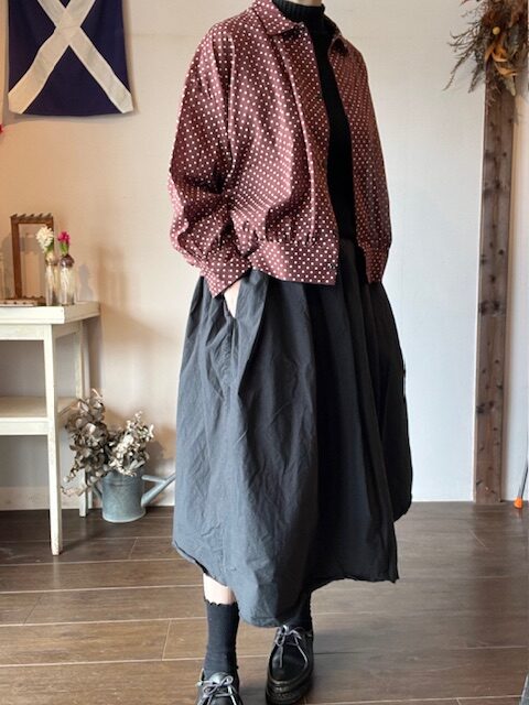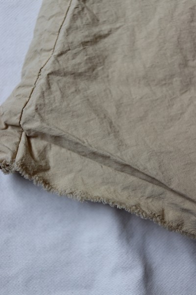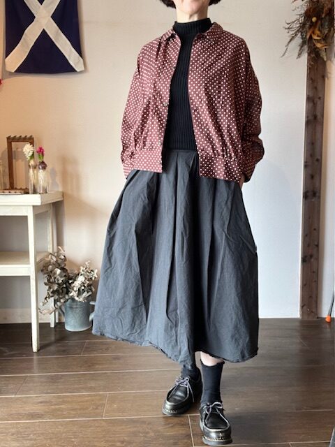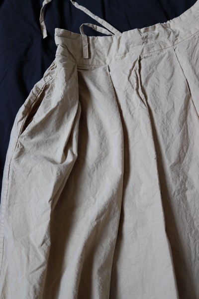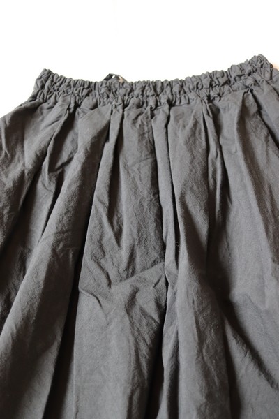 製品染めを施し、洗いざらしの雰囲気に仕上げたタックスカート。裾に生地の耳を使用し、薄く軽やかに仕上げています。ウエストは後ろにのみゴムを通したイージー仕様。ウエスト紐が通っておりサイズ調節が可能です。