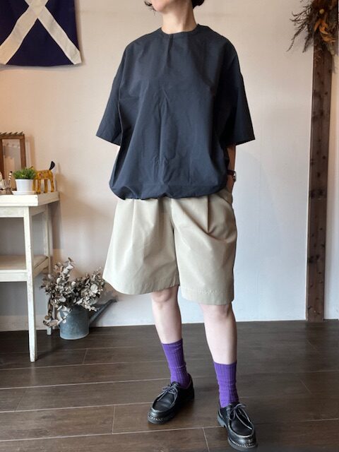 ゆとりのあるボックスシルエットのショートスリーブプルオーバー。肩で開閉するデザインです。裾にドローストリングが付いており、絞ることでシルエットの変化をたのしめます。ユニセックスの 2 サイズ展開です。