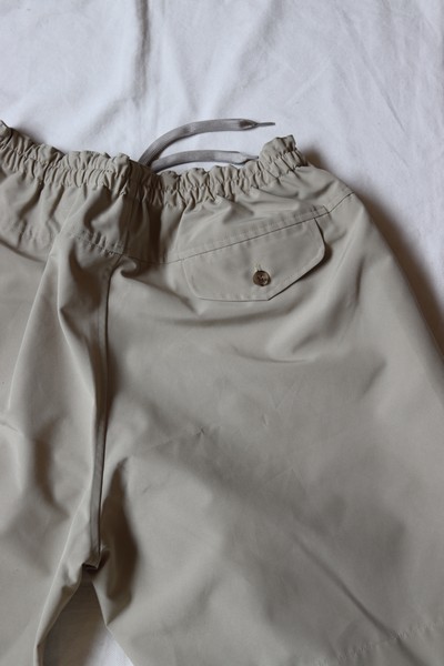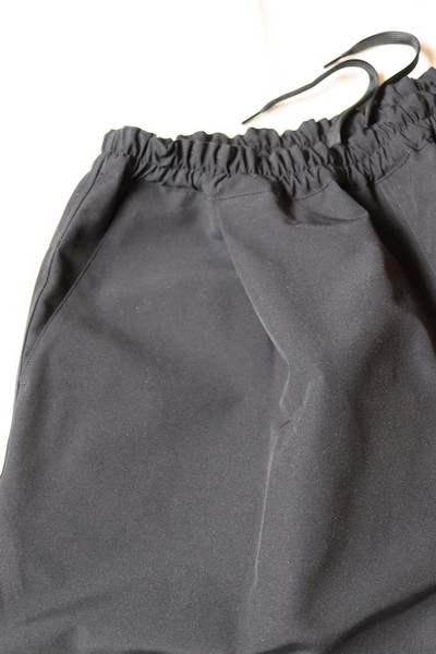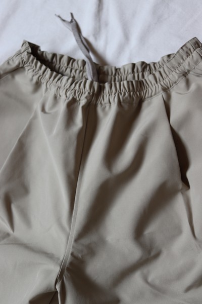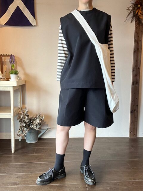 裾巾にゆとりを持たせたボリュームのあるシルエットのショーツ。素材の持つハリがシルエットをより際立たせています。ウエストはゴム+紐のイージー仕様。ユニセックスの 2 サイズ展開です。