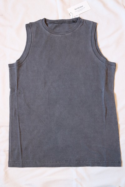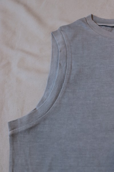 衿ぐりとAHにフライスを使用し、シンプルなデザインながらデイリーに着用いただけるよう耐久性のあるアイテムです。ヴィンテージの風合いをお楽しみいただけます。